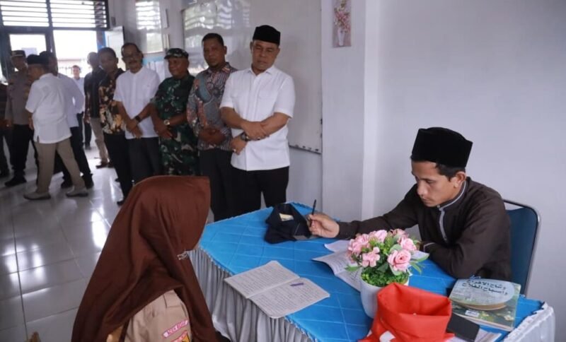 Kota Jantho – Bupati Aceh Besar, H Muharram Idris, didampingi Asisten 1 Farhan AP, Plt Kadisdikbud Aceh Besar Dr Agus Jumaidi SPd MPd, Kadisdik Dayah Aceh Besar Abu Bakar SAg, Camat Peukan Bada Salamuddin SE, dan Muspika Peukan Bada meninjau pelaksanaan ujian Beut Kitab Bak Sikula di SMPN 1 Peukan Bada, Jumat (5/12/2025).