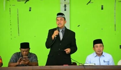 Camat Indrapuri Irda Junaidi, SE., MM memberikan sambutan pada melepas mahasiswa Kuliah Pengabdian Masyarakat (KPM) Universitas UIN Ar-Raniry kembali ke kampus, Senin (25/11/2024). Foto; Ist