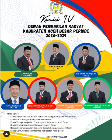 4.Komisi IV Dewan Perwakilan Rakyat Kabupaten (DPRK) Aceh Besar membidangi pembangunan, komisi beranggotakan (7) dewan. Diantaranya Khairuddin, SE sebagai Ketua Komisi dari Partai Golongan Karya (Golkar), Wakil Ketua dijabat Tgk. Irfan Siddiq, S. Pd dari Partai Demokrat, kemudian Sekretaris dijabat Apriono, ST dari Partai Kebangkitan Bangsa (PKB). Sedangkan anggota dari Partai Aceh (PA) Ridha Hidayatullah, S. HI., MM, Muhammad Alif Khairullah dari Partai Keadilan Sejahtera (PKS), kemudian Maulana Akhbar dari Partai Amanat Nasional (PAN), dan Satria Maulana Putra, SE., MM dari Partai Persatuan Pembangunan (PPP).