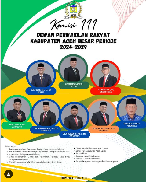 3.Komisi III Dewan Perwakilan Rakyat Kabupaten (DPRK) Aceh Besar Periode 2024-2029. Komisi ini berjumlah delapan orang, membidangi Keuangan dipimpin Syahrizal dari Partai Kebangkitan Bangsa (PKB). Sekretaris dijabat Syahrizal dari Partai Aceh (PA). Kemudian Wakil Ketua dipercayakan kepada Zulfikar, SH., M. Kn dari partai Nasional Demokrat (NasDem). Jajaran anggota diisi Dr. Yusran, S. Pd. I., MA, Rahmat Aulia, S. Pd. I., Ruslan Effendi, S. Hi, Zamzami, A. Md dan Firdaus Armia.