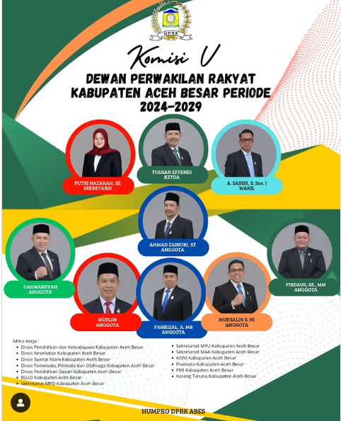 Komisi V Dewan Perwakilan Rakyat Kabupaten (DPRK) Aceh Besar telah ditetapkan. Komisi ini menjadi komisi paling ramai diisi oleh sembilan anggota dewan membidangi Kesejahteraan Rakyat dan Kesitimewaan Aceh dengan (13) tiga belas mitra kerja.