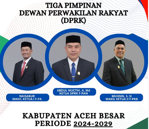 Kota Jantho – Pimpinan Dewan Perwakilan Rakyat Kabupaten (DPRK) Aceh Besar periode 2024-2029. Abdul Mucthi, A. Md dipercayain sebagai Ketua DPRK dari Fraksi Partai Amanat Nasional (PAN) daerah pemilihan (Dapil) II meliputi lima kecamatan yaitu kecamatan Lhoknga, Leupung, Lhoong, Peukan Bada dan Pulo Aceh.