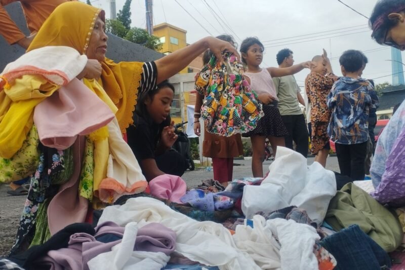 Medan – Aksi Pasar Gratis pakaian bekas yang digelar komunitas Punk Medan menarik perhatian warga di Kelurahan Tanjung Rejo, Kecamatan Medan Sunggal, Sabtu (22/11/2025) sore.