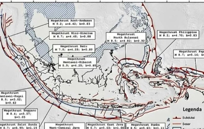 Dilansir dari akun Instagram BMKG, @infobmkg, Senin 10 November 2025, terdapat 13 titik zona gempa megathrust di Indonesia yang berada pada enam zona subduksi aktif.