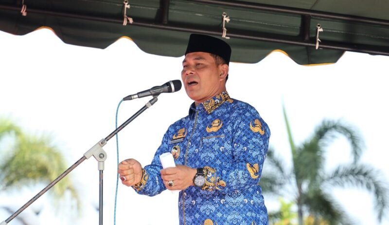 Bupati Aceh Besar, Haji Muharram Idris saat memimpin upacara Apel rutin Pembak Aceh Besar, di Kota Jantho, Senin (17/02/2025). Foto: Ist