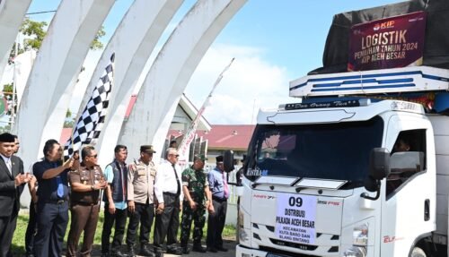 Kota Jantho – Penjabat (Pj) Bupati Aceh Besar, Muhammad Iswanto SSTP MM, bersama unsur Forkopimda Aceh Besar melepas distribusi logistik Pemilihan Kepala Daerah (Pilkada) 2024 menuju semua Kecamatan di Aceh Besar. Logistik tersebut akan dikirimkan menggunakan mobil truk dan dikawal ketat oleh pihak keamanan. Penglepasan tersebut berlangsung di Komplek Jantho Sport City (JSC), Aceh Besar, Senin (25/11/2024).