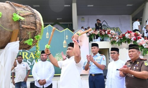 Kota Jantho – Penjabat (Pj) Bupati Aceh Besar Muhammad Iswanto SSTP MM menabuh beduk puncak peringatan Kenduri Maulid Aceh Besar di Lapangan Bungoeng Jeumpa, Kota Jantho, Selasa (10/12/2024).
