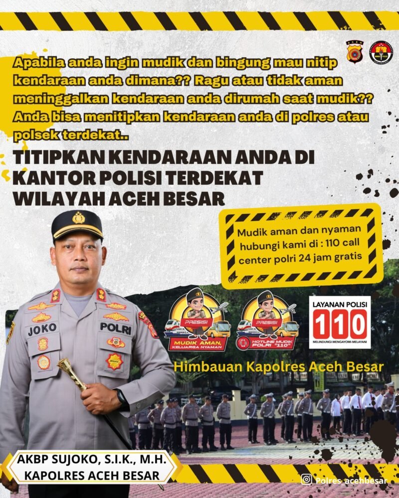 Kapolres Aceh Besar AKBP Sujoko S.I.K.,M.H., dalam keterangannya menjelaskan bahwa pihaknya membuka fasilitas penitipan ini sebagai alternatif bagi masyarakat yang ingin memastikan kendaraannya tetap aman selama ditinggal mudik.