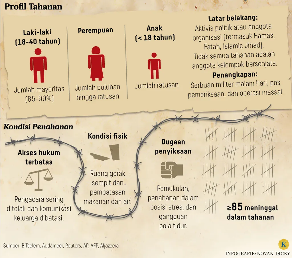 Sebagian ditahan bertahun-tahun tanpa pernah diadili. Israel memakai istilah Penahanan Administratif untuk kebijakan itu.